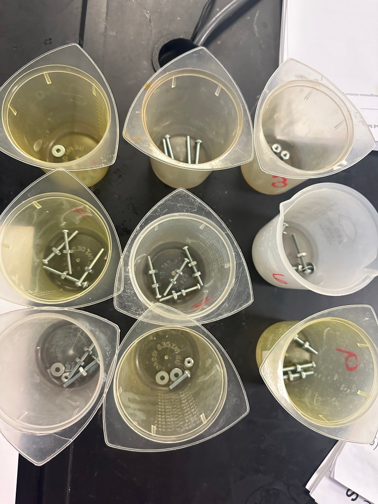The students were informed of the differences between the nuts and bolts. Making distinctions between the shapes and sizes of the objects. The students then filled out a table identifying the combinations classification. The students then did the same with chemicals and elements that they are familiar with.