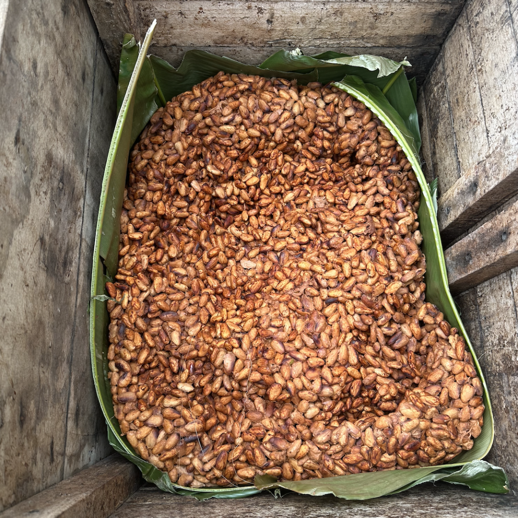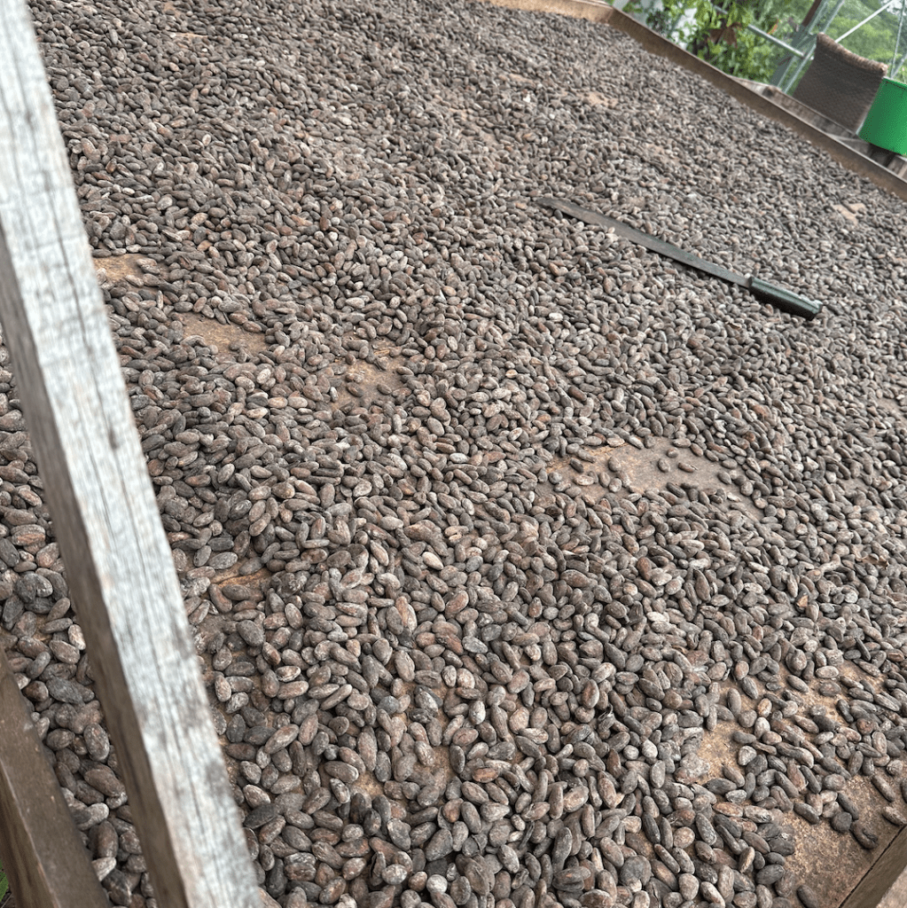 The Cocoa fruit had a slimy covering over a bitter seed. The seed was purple when bit into and crunchy, like most nuts. The Cocoa fruit is fermented for 1-7 days depending on the choice of the farmer. The fermentation time provided very different tastes between the chocolate. The cocoa seeds are then dried to completion, if not then mold may be produced that is not good for the final product.
