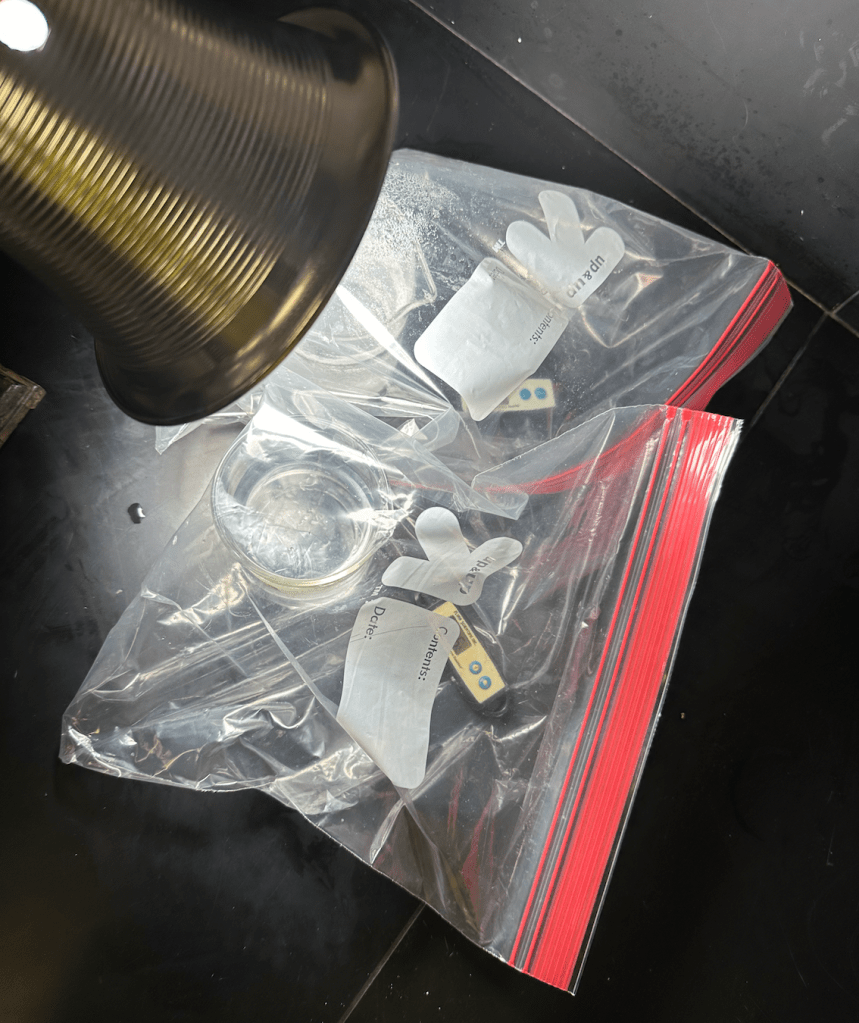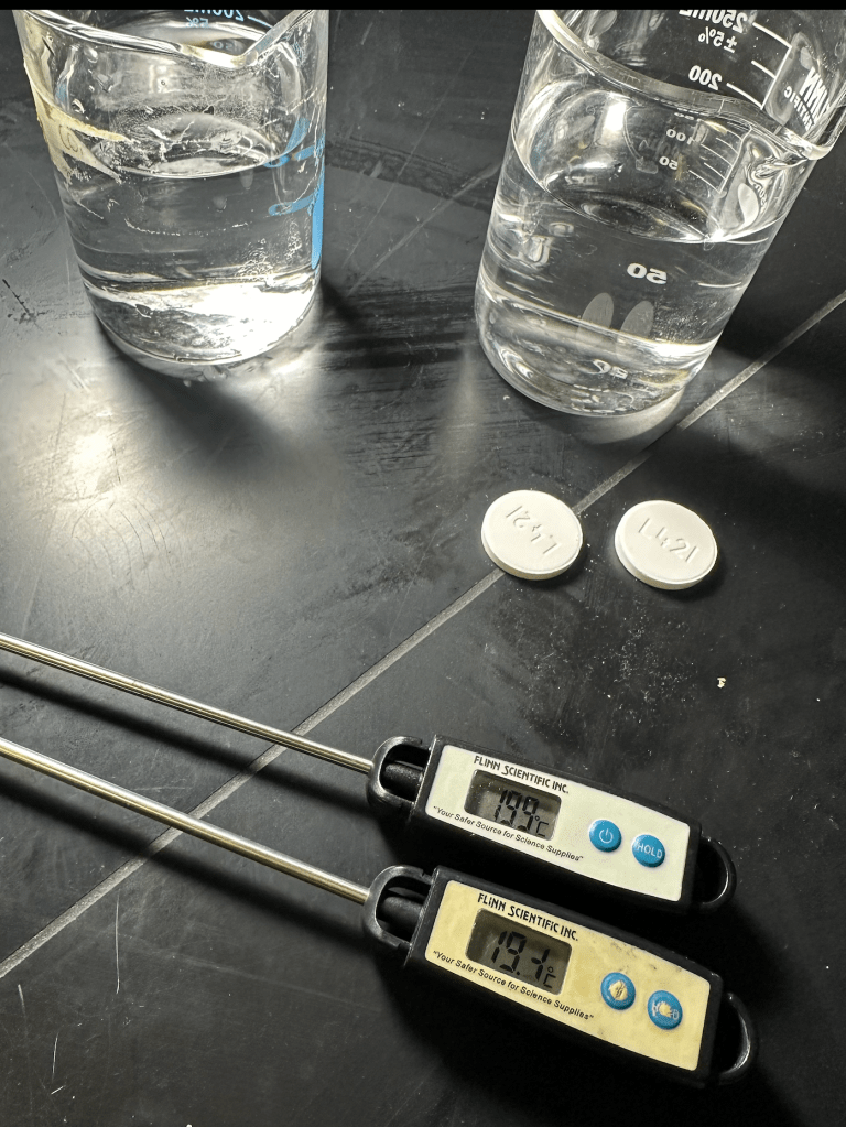 The students were given a ziploc bag, two beakers, an alka seltzer tablet, and two thermometers. In the first beaker was just 200 mL of water, in the second beaker was 200 mL of water and two alka seltzer tables. The beakers were placed into two separate ziplock bags with the thermometer to next to the beaker, and zipped closed.