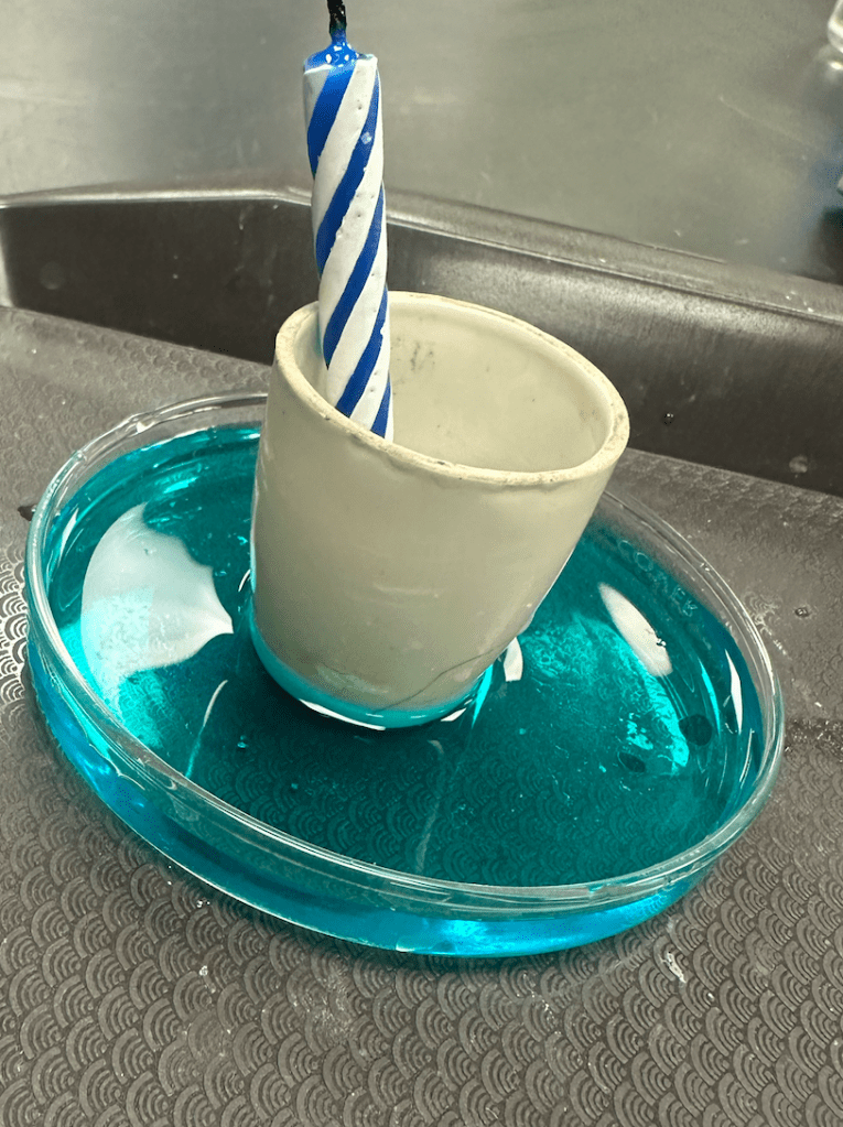 The first experiment done required a beaker, petri dish, crucible candle, and matches. The petri dish was 3/4 full of water and food coloring to see the movement of the water easily. After the beaker is placed over the candle the water quickly sucks into the beaker, creating a vacuum. Displaying the relationship between pressure, temperature, and volume.