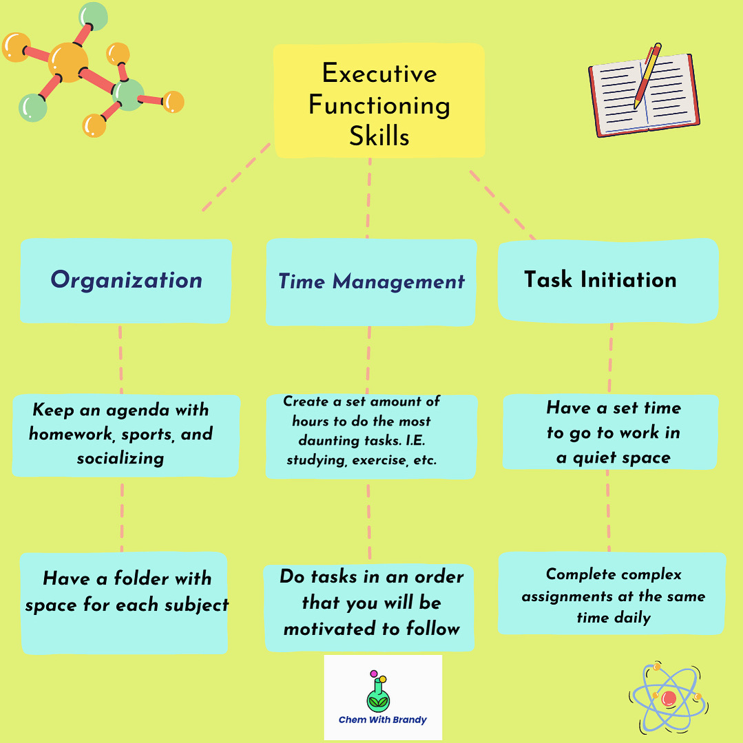 Som executive functioning skills that I like to hone in on are Organization, Time Management, and Task Initiation. I have listed some ideas to help students get started with their classwork and homework, to excel in and out of the classroom. Below is a quick reference sheet to guide you in your academic goals.