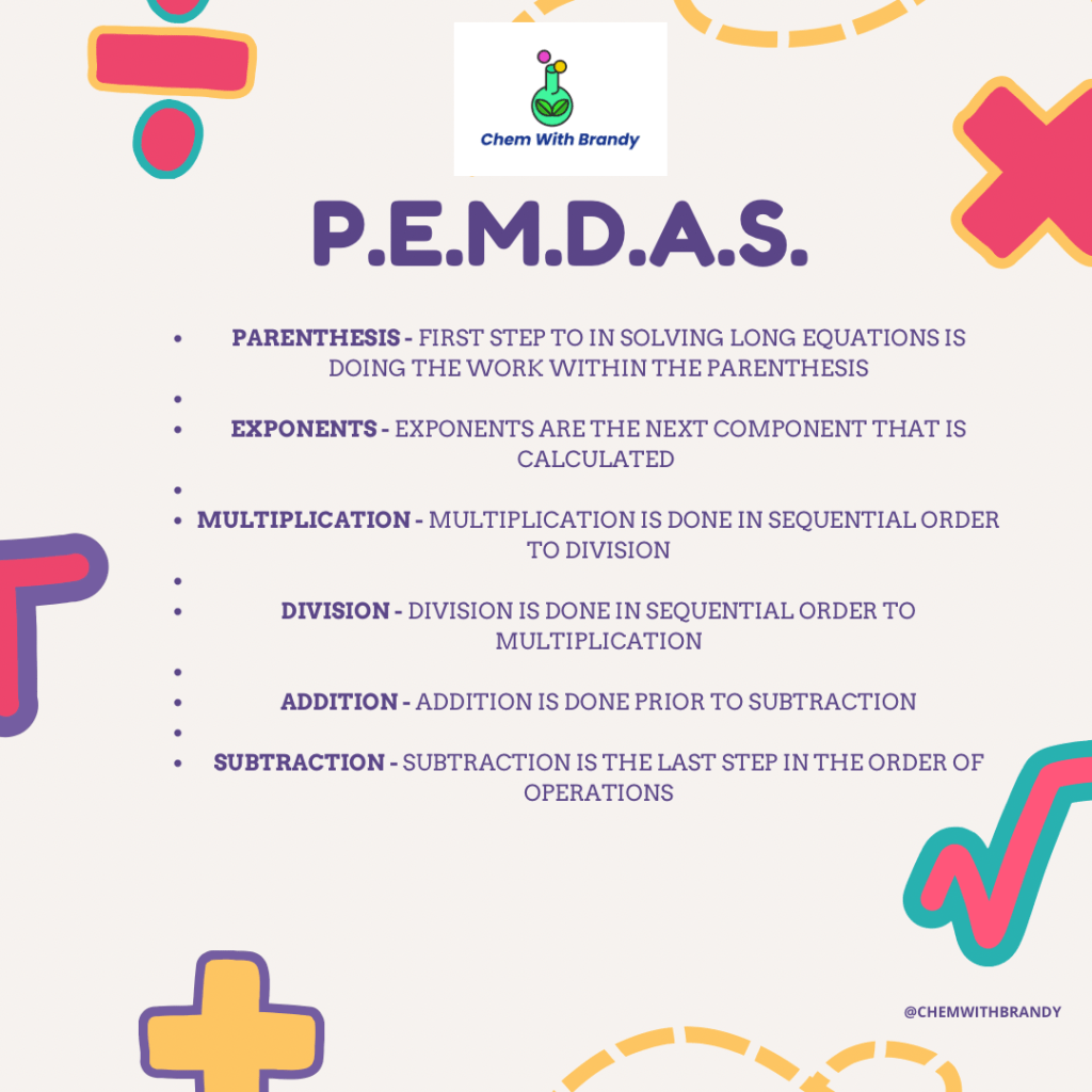 PEMDAS is an acronym used to help students solve multiple step math problems. The process is also known as the order of operations. PEMDAS stands for parenthesis, exponents, multiplication, division, addition, then subtraction.