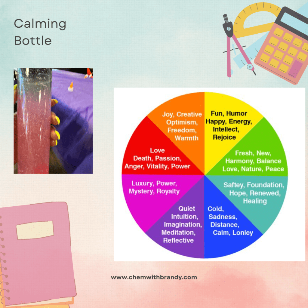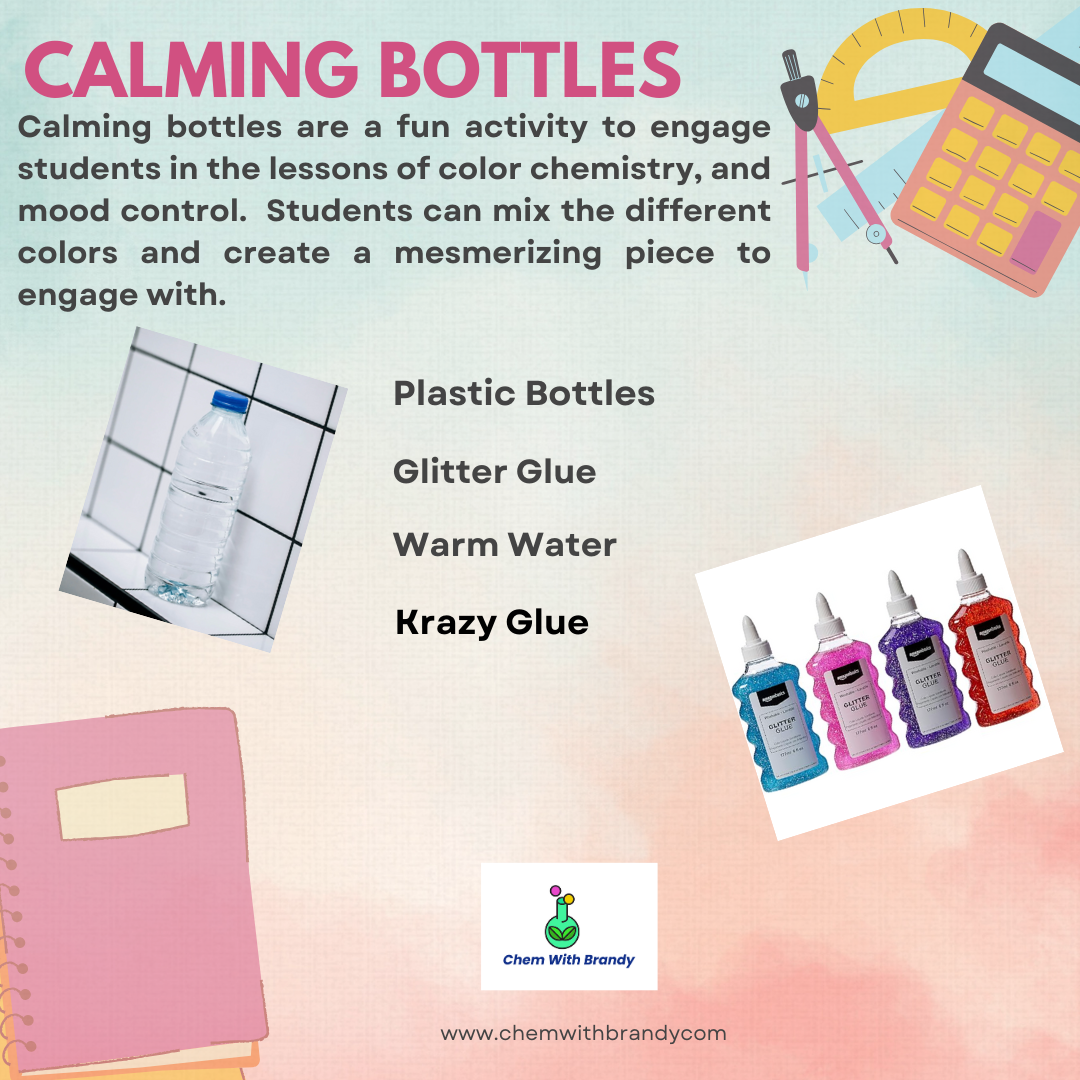Calming Bottle are a fun project to create that can encompass a multitude of subjects. In a camp this summer I helped create calming bottles. The materials were few and the bottles were, calming. Students would use the bottles as a “fidget” tool during focused learning time.
