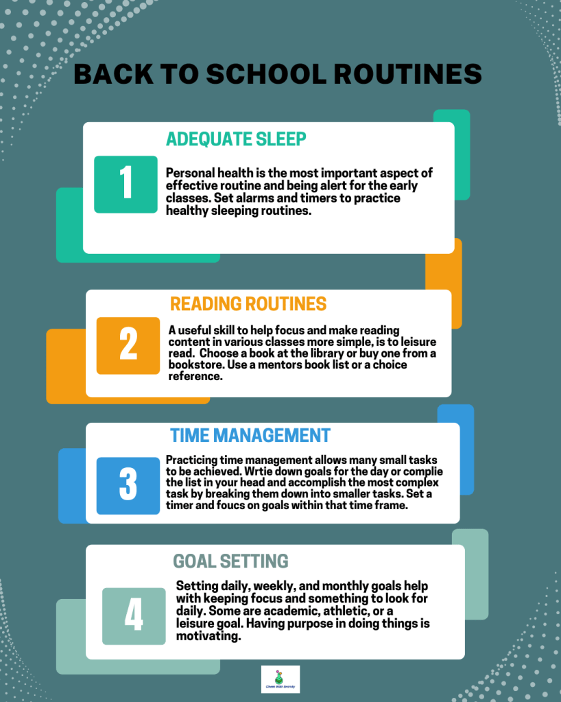 Here is a short list of ideas of how to have an efficient back to school experience. Add your details of knowledge of how to excel at the beginning of the year using this as a foundation. Back to school time is an excellent time to begin healthy routines and sets goals to focus on for the second half of the year.