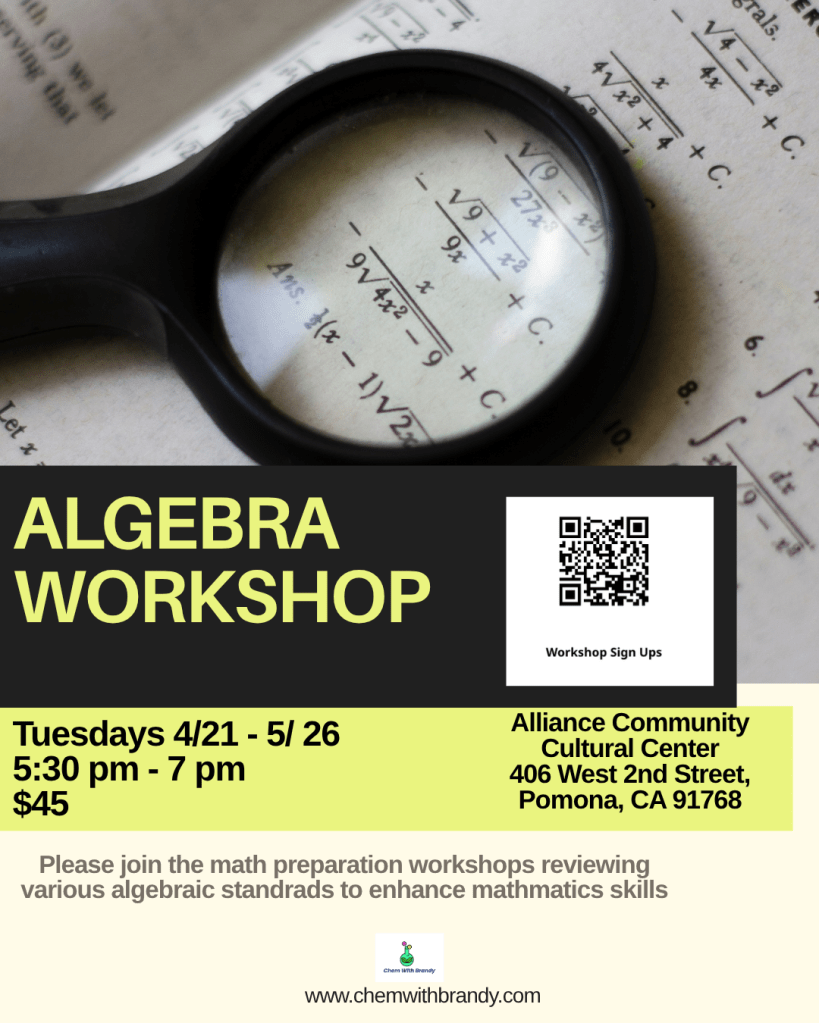 Please join Chemistry With Brandy on Tuesdays from 4/21 to 5/26 as we enhance algebraitc skills for students in their current courses or future courses. The workshop is best for students not only currently in algebra, but looking to correct missed understanding in previous courses. The classes will be held at the Alliance Community Cultural Center in Pomona for $45 dollars a session.